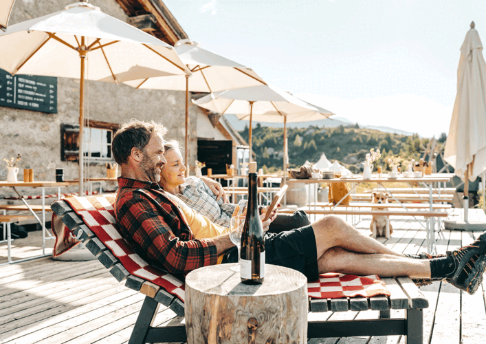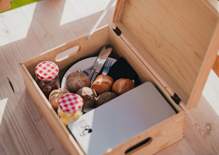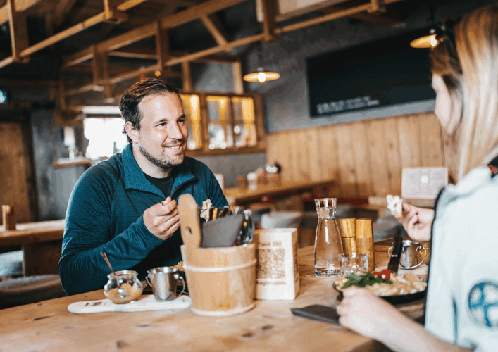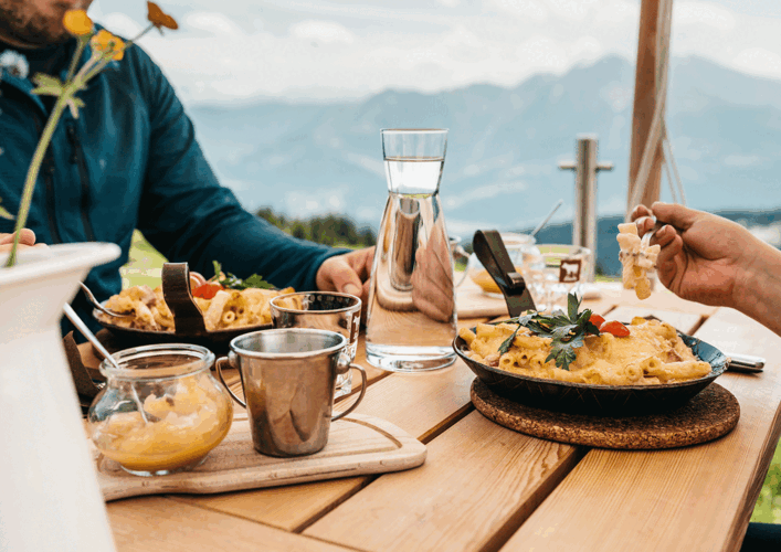 Der Morgen beginnt mit einem Frühstück. Stellen Sie sich Ihre Box am TukTuk-Buffet individuell zusammen. Am Abend werden die Gäste mit einem Menü mit regionalen Produkten im Restaurant Stalla www.stalla-alpnagens.ch verwöhnt. Wer die Zweisamkeit schätzt, kann sich im Restaurant mit Getränken eindecken und den Abend auf der eigenen Terrasse bei Kerzenschein ausklingen lassen.