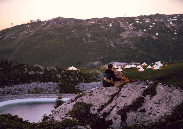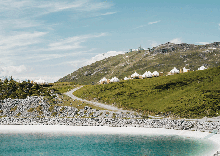 Das Pop-Up Dorf besteht aus 20 gediegenen Zelteinheiten, welche sich entweder direkt am Speichersee oder auf einer Anhöhe befinden und zwei bezaubernden Mahal Zelt-Suiten. Urbane, Familien, Geniesser und Romantiker erfreuen sich eines exklusiven, hochalpinen Naturerlebnisses gepaart mit Wohnkomfort, regionalen Leckerbissen und ausgezeichnetem Wein.