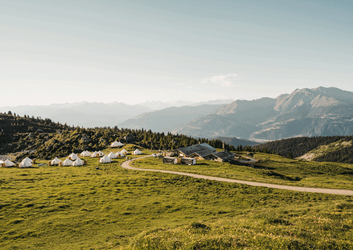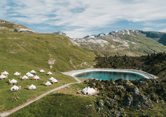 Der TCS meldet sich auch diesen Sommer mit dem Pop-Up-Glamping-Dorf oberhalb von Laax zurück. Von Ende Juni bis Mitte September werden die gemütlich und komfortabel eingerichteten Baumwollzelte auf der 2‘000 Meter über Meer gelegenen Alp Nagens aufgeschlagen. Der Standort besticht durch seine Lage in unmittelbarere Nähe des Speichersees und den atemberaubenden Blick auf das Bündner Bergpanorama.